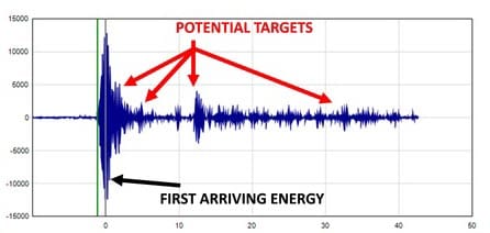 Typical received waveform showing the first arriving energy and potential targets