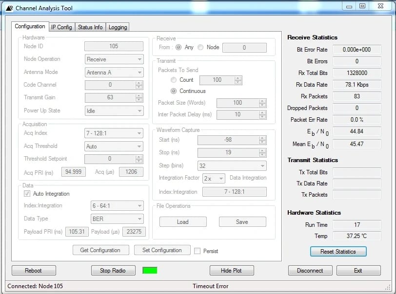 Communications Statistics Provided: CAT provides communications statistics for all received data including: Eb/No, Bit Error Rate and Packet Error Rate.